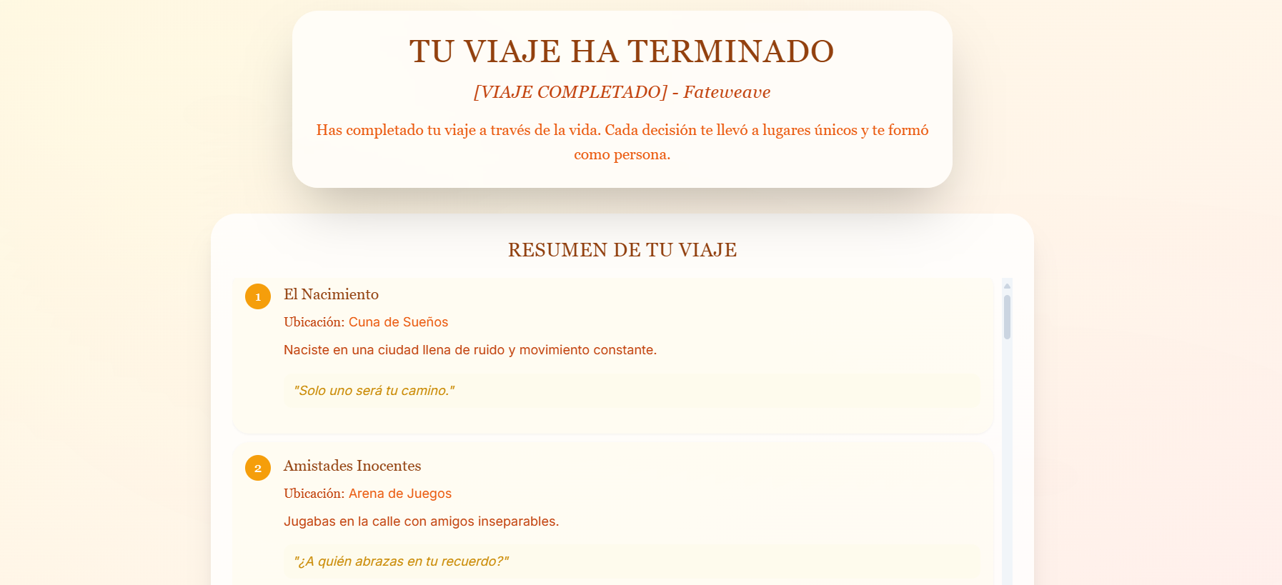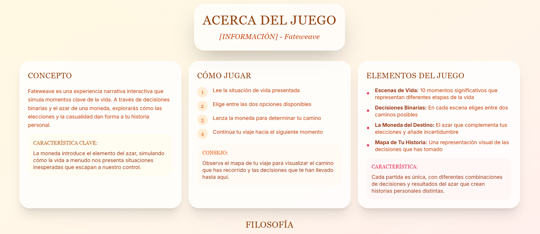 Fateweave es un ejercicio de diseño narrativo que explora una pregunta filosófica fundamental: ¿Cuánto de nuestra vida es elección y cuánto es azar?*