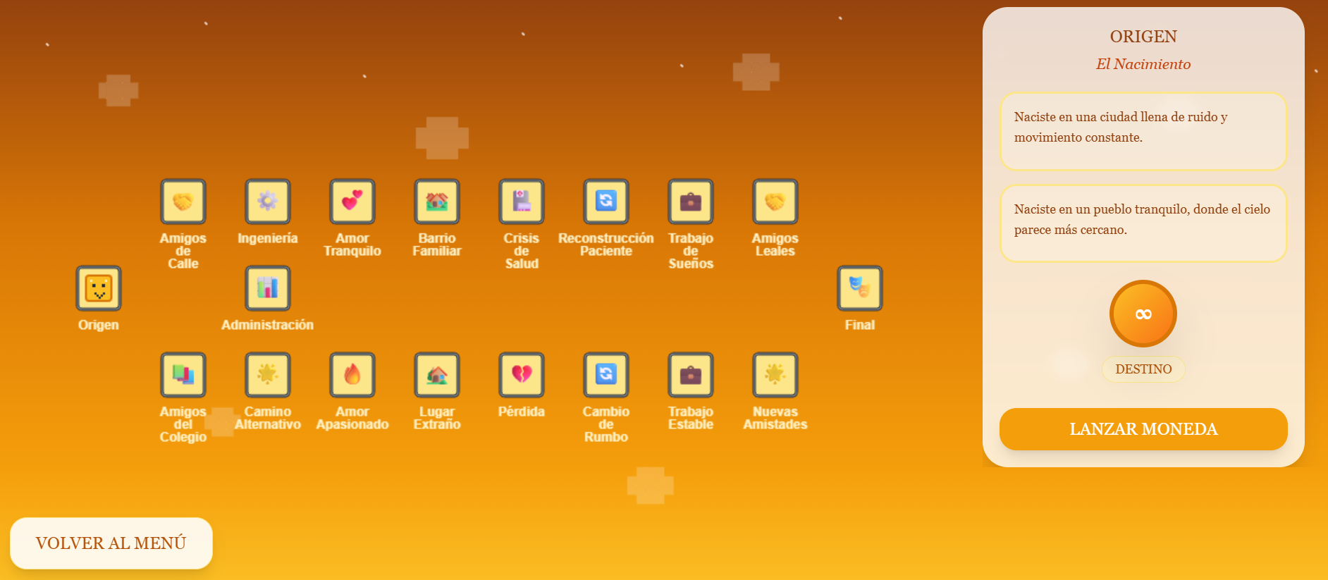 Este proyecto nos permitió explorar cómo una mecánica simple puede sostener una experiencia narrativa profunda. El lanzamiento de moneda, aparentemente básico, se convierte en una metáfora poderosa de la vida real, donde nuestras elecciones se entrelazan con circunstancias que no controlamos.